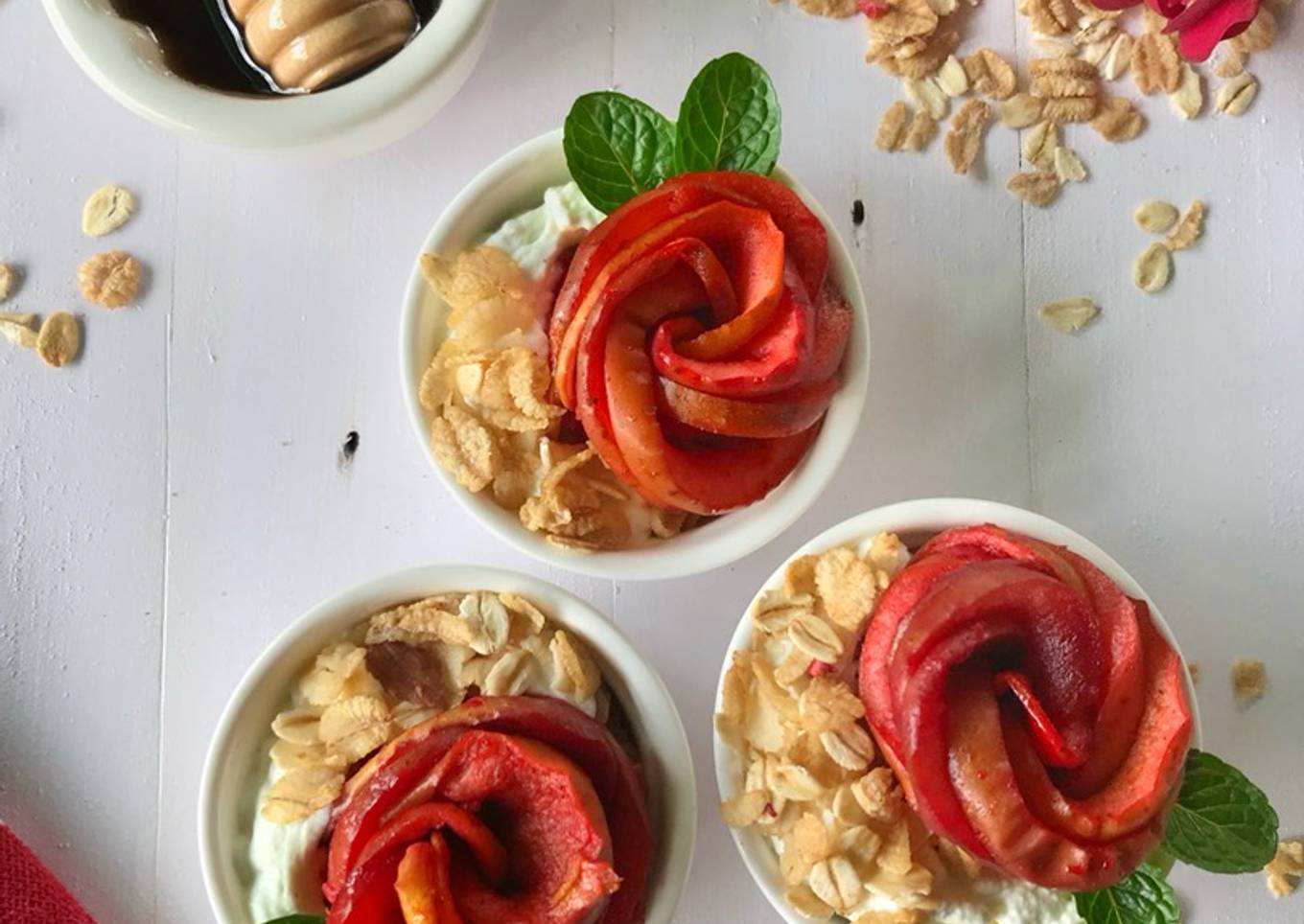 Hey everyone, I hope you are having an amazing day today. Today, we're going to make a distinctive dish, Poached apple roses in rhododendron juice with muesli and greek yoghurt. It is one of my favorites food recipes. For mine, I will make it a bit tasty. This is gonna smell and look delicious.