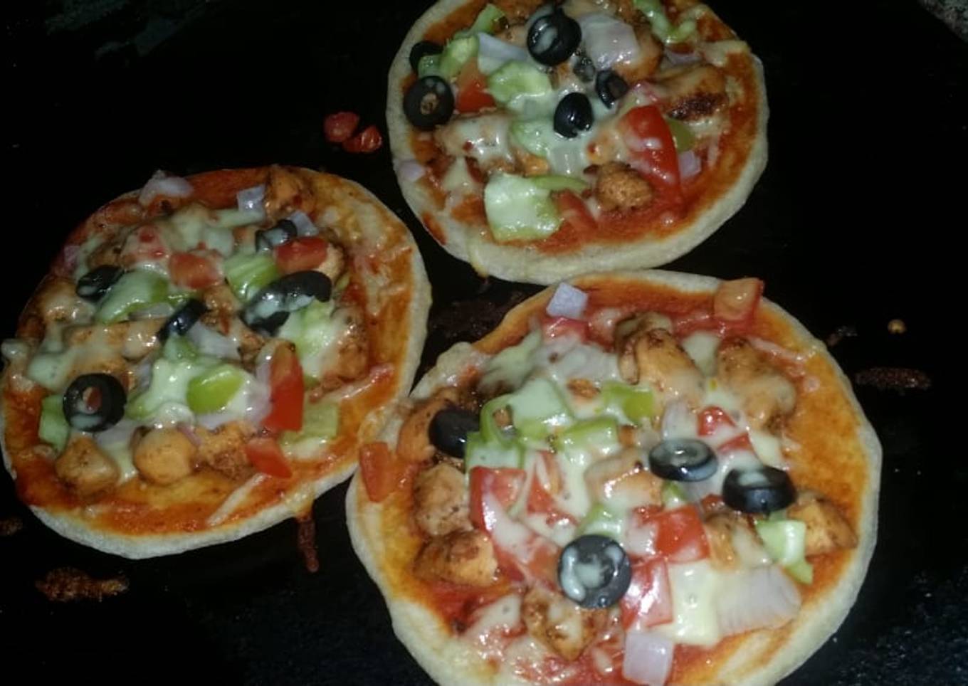 - Ab choty choty pery bana ke tawa pe rakhy aik side paka lian halki anch pe jab tak bubble na a jai bubble a jai to side change kar dain us ke uper pizza sauce. Phir cheese onion. Tomato. Olive. Chicken phir cheese dhal dain or cover kar ke rakh dain 10 mint ke ley ready