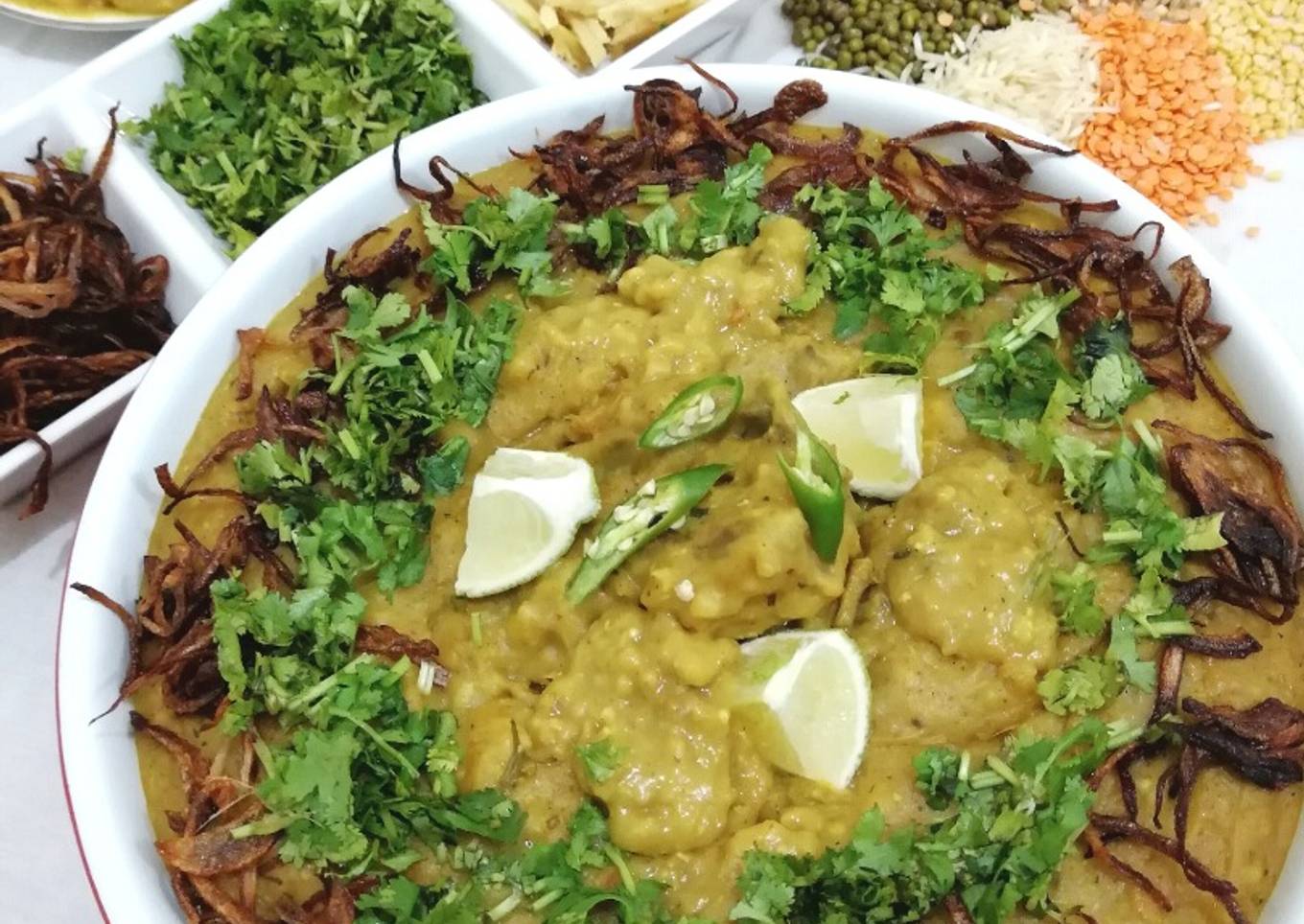 - Garnish with mint,coriander,brown onion,ginger julienne and lemon wedges...